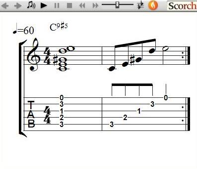 In order to help learn the names of the notes of the Fretboard and for each chord they are written below each diagram. The numbers below the note names indicate suggested fingerings for the Left Hand. Beside each diagram is the Score with the chord symbol and Tablature.