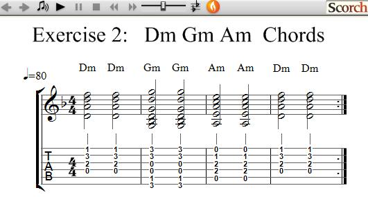 This exercise uses the Dm, Gm and Am chords which are each shown separately for you. Once you know how to play each chord try the exercises to get use to changing between chords and learning how to get the timing with your right hand by strumming as shown.
