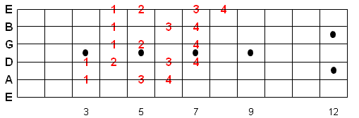 There are 3 types of scale fingering patterns shown below. The Caged system is the easiest pattern to learn and provides for a 2 octave range often in 1 hand position. All of the numbers in RED are the suggested fingerings. Once you memorize this fingering pattern you can reuse it by moving up or down the fretboard. Whatever note you start on is the 1st note of the scale.