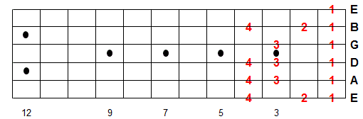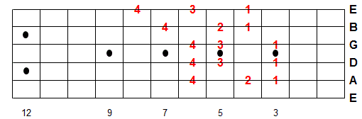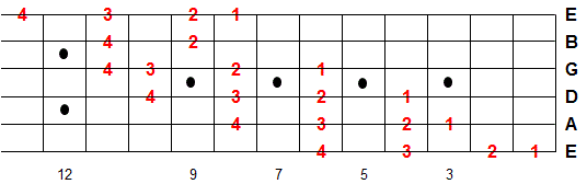 There are 3 types of scale fingering patterns shown below. The Caged system is the easiest pattern to learn and provides for a 2 octave range in 1 hand position. All of the numbers in RED are the suggested fingerings. Once you memorize this fingering pattern you can reuse it by moving up or down the fretboard. Whatever note you start on is the 1st note of the scale.