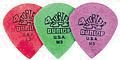 Guitar picks - A Guitar Pick is a rounded-triangle shaped piece of plastic used to "pick," that is strum or hit, the strings of a guitar and comes in varying Sizes and thickness to accommodate the different playing styles and kinds of strings. See our web Page on GUITAR PICKS in the Guitar Intro section.