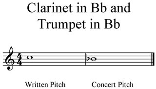 The concert pitch of a transposing instrument may be higher or lower than the written pitch. The instruments listed above all sound lower than the written notes. The Clarinet in Bb and the Trumpet in Bb each sound a Major 2nd lower than written.