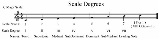 The most important note of any Scale or Key is the keynote or TONIC, the 1st degree of every scale. Almost as imporatnt as the TONIC is the DOMINANT. This word is from the Latin "dominus" meaning master. The Chord built on the Dominant is so strong that it "masters" the Key, as you will see in Chord Scales used for Chord Progressions.