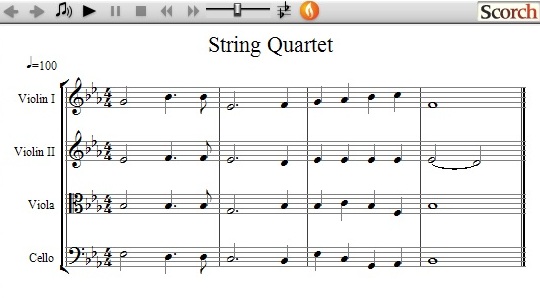 The following is a quick 4 bar sample of what a String Quartet would look and sound like.